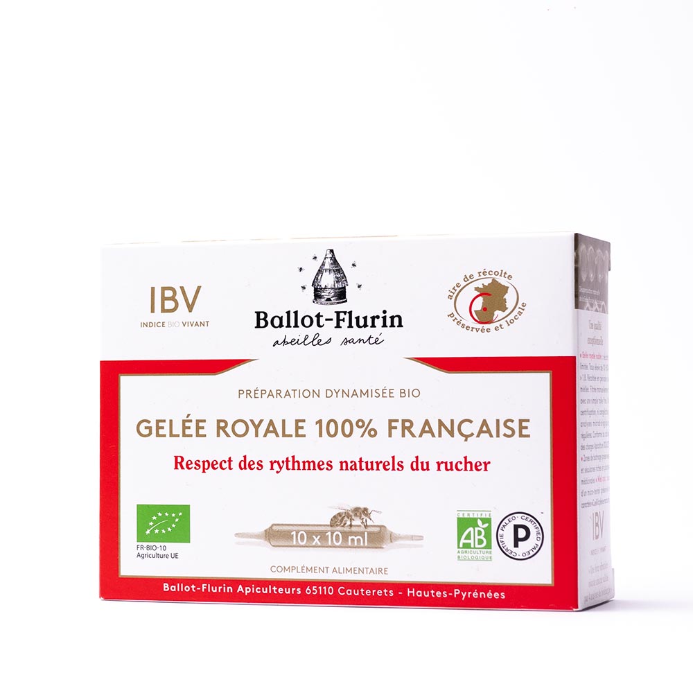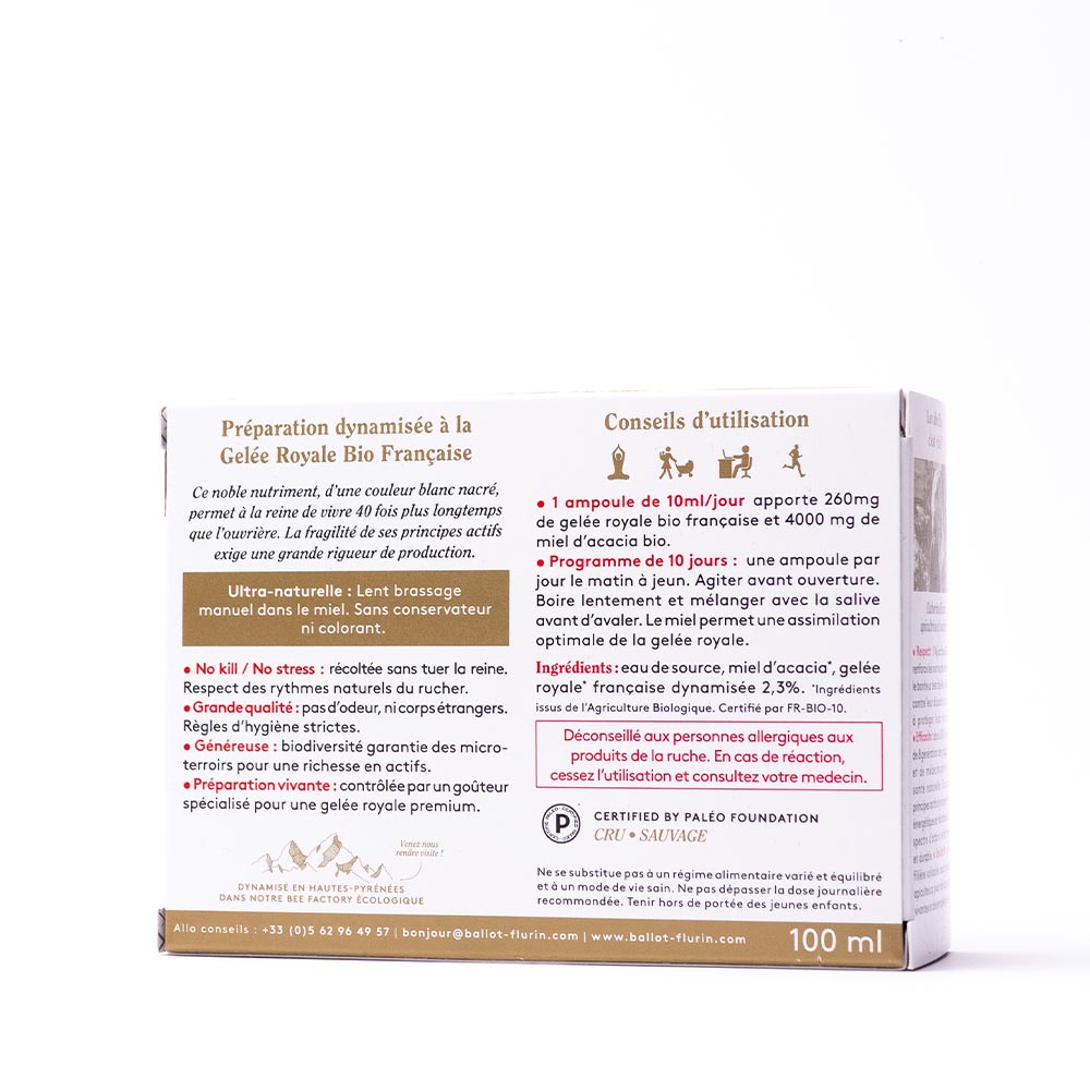 1 ampoule de 10 ml vous apporte : 260mg de gelée royale bio française et 4000mg de miel acacia