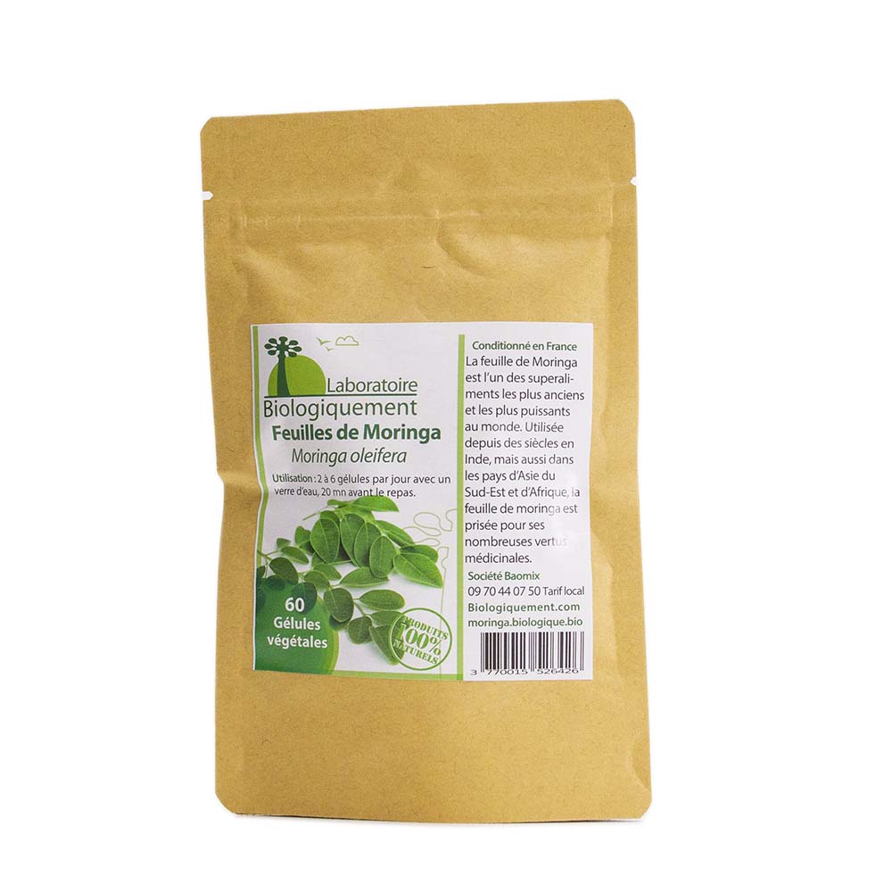 Conditionnement : Sachet de 60 gélules végétales de poudre de feuilles de Moringa dosées à 250mg (culture sans pesticides).