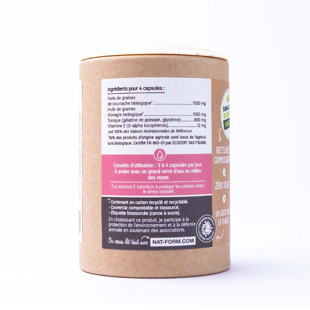 Complément alimentaire à base d’huile de Bourrache/Onagre Bio. Les compléments alimentaires doivent être utilisés dans le cadre d’un mode de vie sain et ne pas être utilisés comme substituts d’un régime alimentaire varié et équilibré.