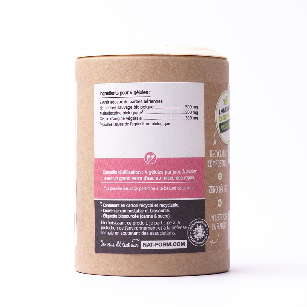 Complément alimentaire à base de pensée sauvage Bio. Les compléments alimentaires doivent être utilisés dans le cadre d’un mode de vie sain et ne pas être utilisés comme substituts d’un régime alimentaire varié et équilibré.