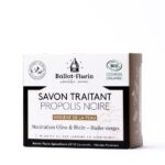 Savon traitant à la propolis noire, macérât d’huiles vierges d’olives & de ricin et plantes de nos jardins récoltées en biodynamie.